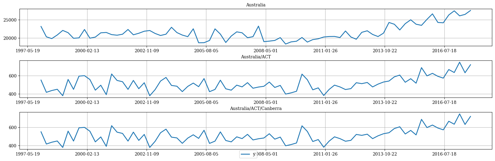 In this example we will use the Tourism dataset from the Forecasting: Principles and Practice book. The dataset only contains the time series at the lowest level, so we need to create the time series for all hierarchies.| Country | Region | State | Purpose | ds | y | |