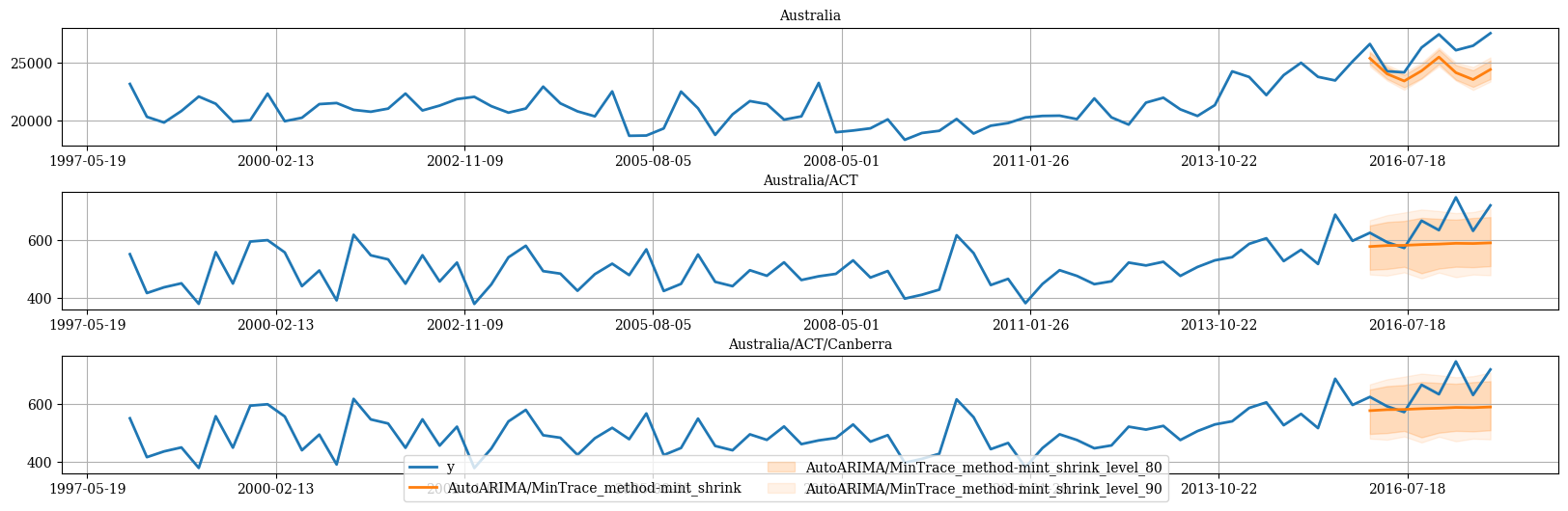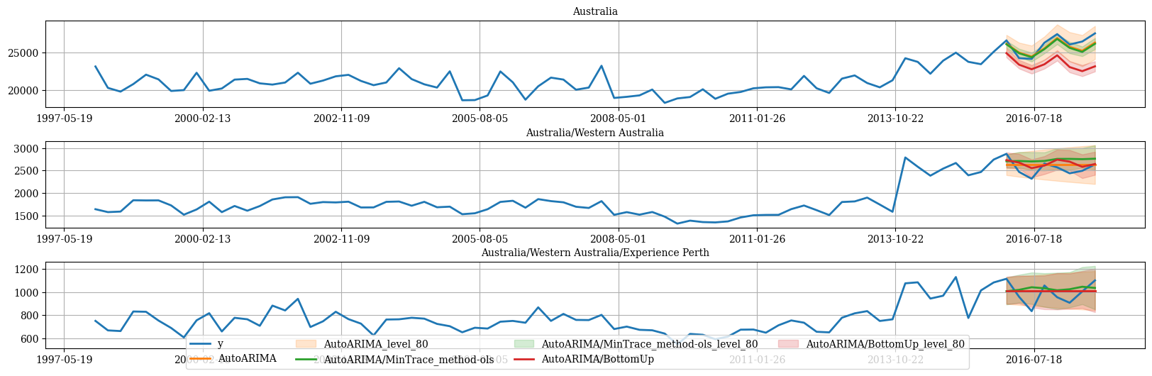 The following cell makes the previous forecasts coherent using theHierarchicalReconciliation class. In this example we use BottomUp