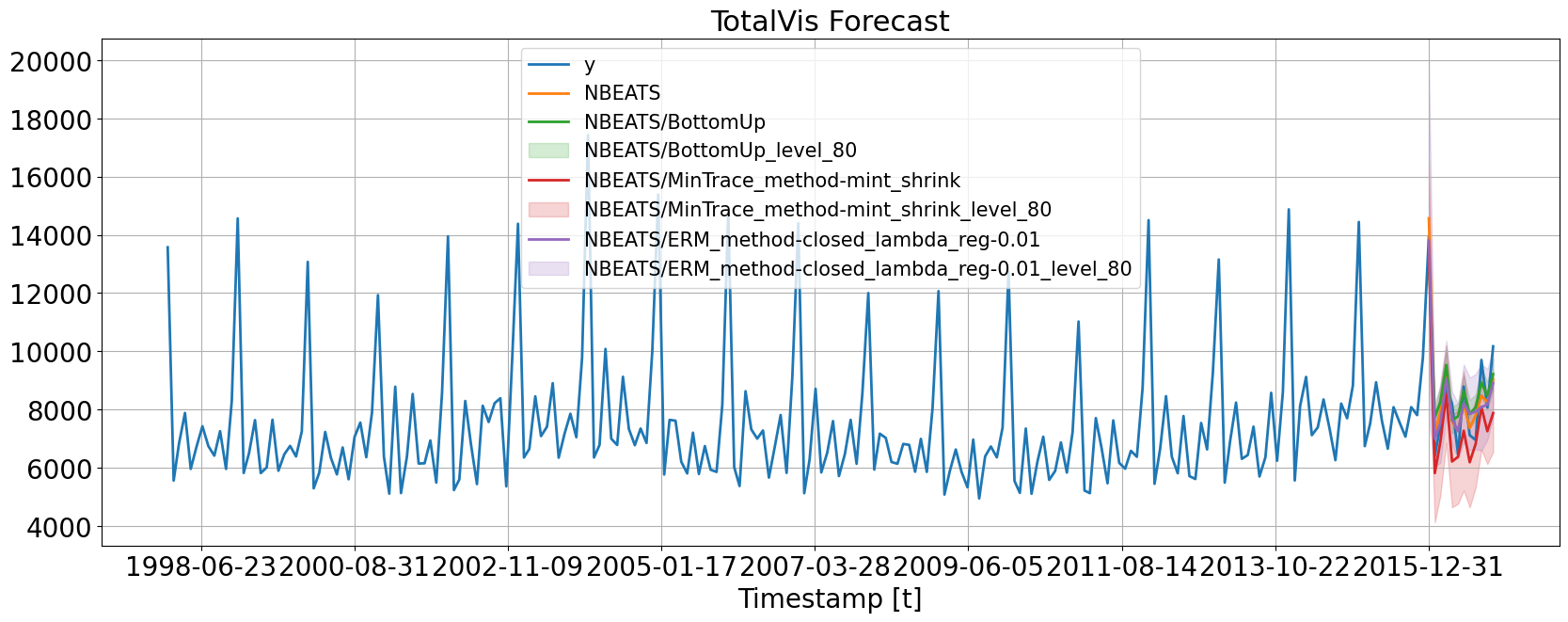 HierarchicalForecast is compatible with many different ML models. Here, we show two examples:1. NBEATS, a MLP-based deep neural architecture.