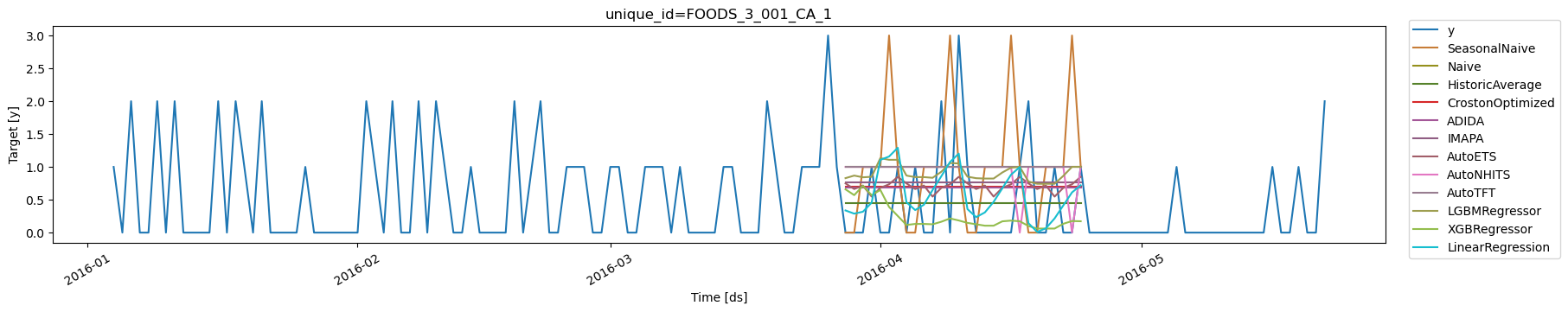 | unique_id | ds | SeasonalNaive | Naive | HistoricAverage | CrostonOptimized | ADIDA | IMAPA | AutoETS | AutoNHITS | AutoNHITS-lo-90 | AutoNHITS-hi-90 | AutoTFT | AutoTFT-lo-90 | AutoTFT-hi-90 | LGBMRegressor | XGBRegressor | LinearRegression | |