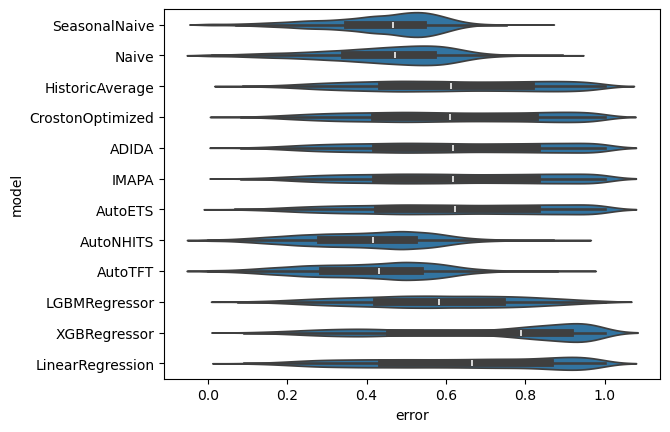 In this section, we will evaluate the performance of each model for each time series.| unique_id | metric | SeasonalNaive | Naive | HistoricAverage | CrostonOptimized | ADIDA | IMAPA | AutoETS | AutoNHITS | AutoTFT | LGBMRegressor | XGBRegressor | LinearRegression | |