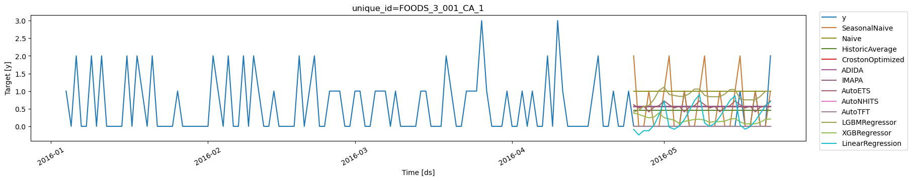 | unique_id | ds | cutoff | y | SeasonalNaive | Naive | HistoricAverage | CrostonOptimized | ADIDA | IMAPA | AutoETS | |