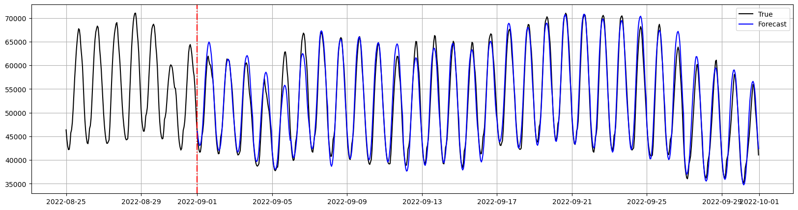 plot_df = pd.concat([Y_df.tail(24*5).reset_index(drop=True), Y_hat_df]).set_index('ds') # Concatenate the train and forecast dataframes