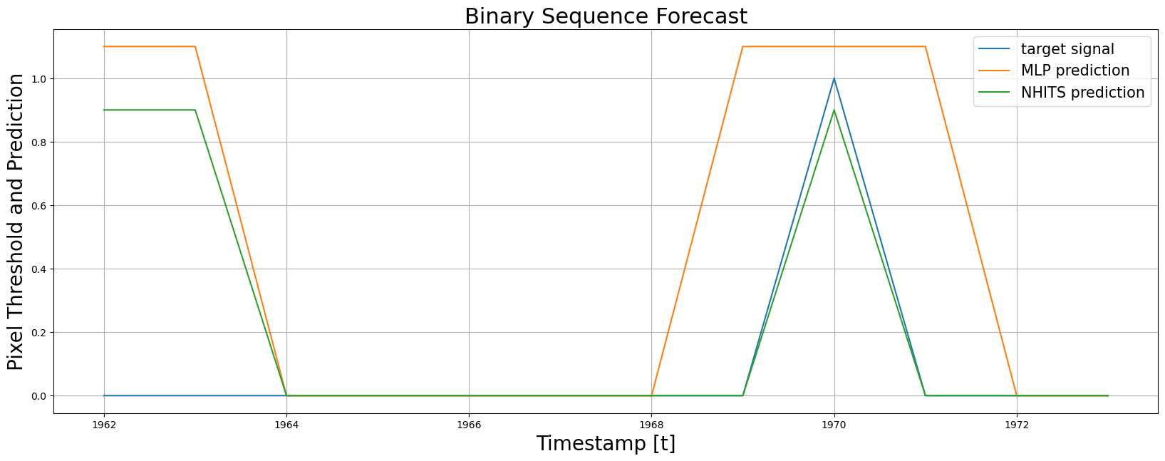 Finally, we plot the forecasts of both models against the real values. And evaluate the accuracy of theMLP and NHITS temporal classifiers.
