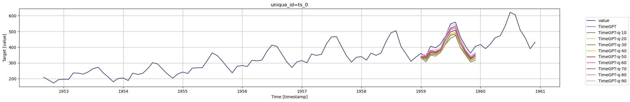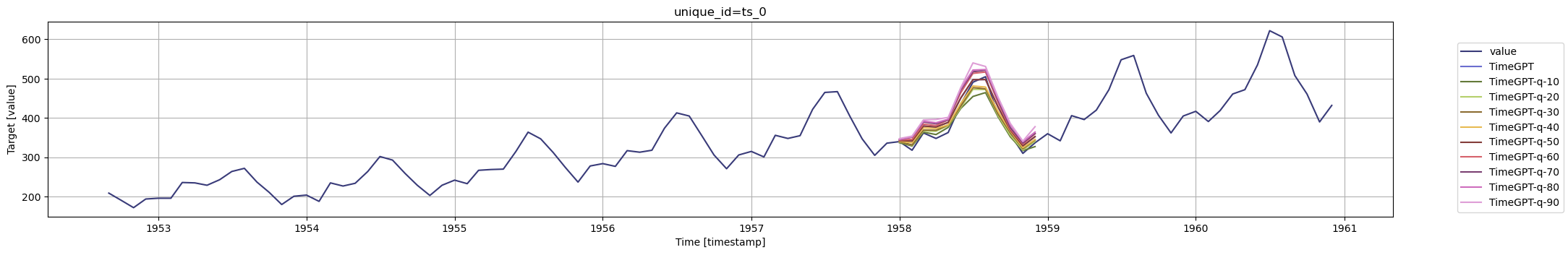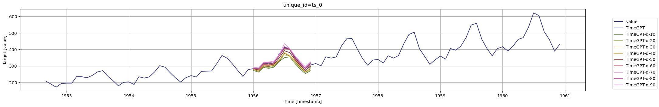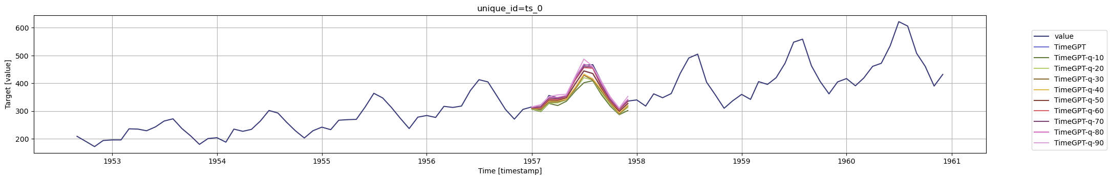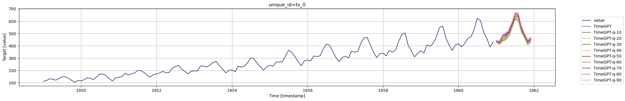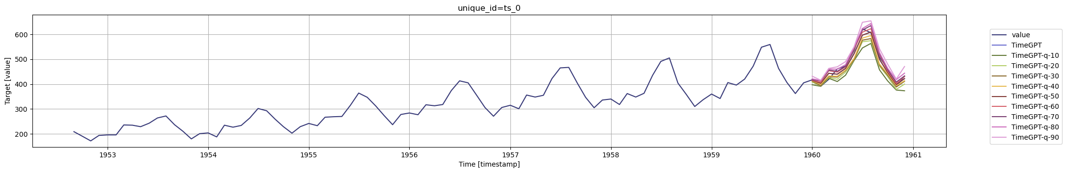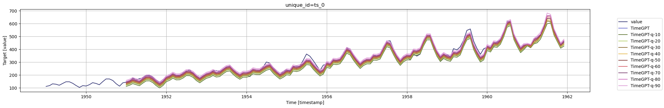 When using TimeGPT for time series forecasting, you can set the quantiles you want to predict. Here’s how you could do it:| timestamp | TimeGPT | TimeGPT-q-10 | TimeGPT-q-20 | TimeGPT-q-30 | TimeGPT-q-40 | TimeGPT-q-50 | TimeGPT-q-60 | TimeGPT-q-70 | TimeGPT-q-80 | TimeGPT-q-90 | |