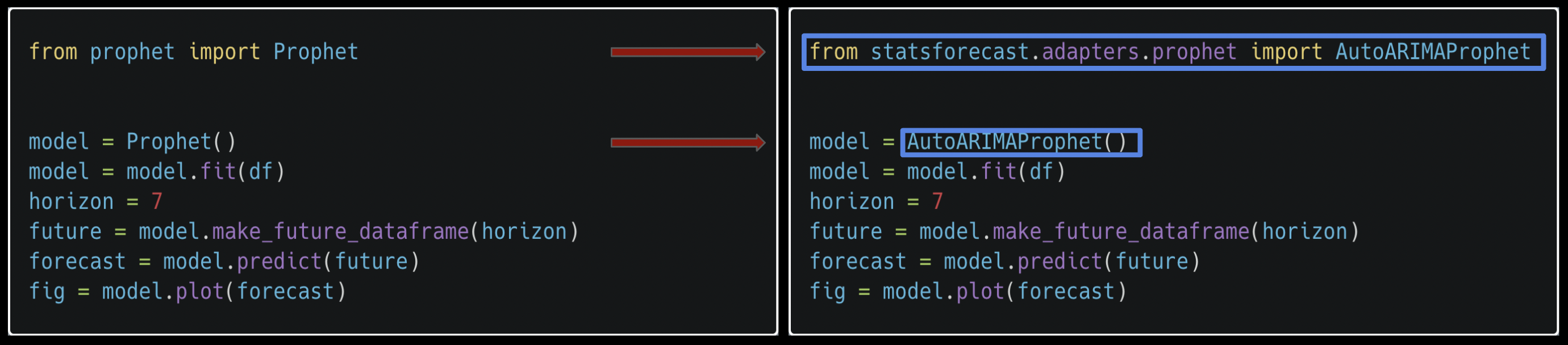 FB-Prophet is one of the world’s most used time series forecasting models. Its GitHub repository has more than 14 thousand stars, and more than a hundred repositories depend on it. However, in many scenarios, FB-Prophet does not offer good performance in terms of time and accuracy. This lacking performance suggests that the FB-Prophet’s success can be explained mainly by its usability. For example, adding exogenous and calendar variables is almost trivial. To contribute to the forecasting community, we created a FB-Prophet API adapter that lets you use Prophet’s useful methods without accuracy and computational downsides. Just import this AutoARIMAProphet adapter and replace the Prophet class to start using AutoARIMA in any of your existing pipelines.Empirical validation