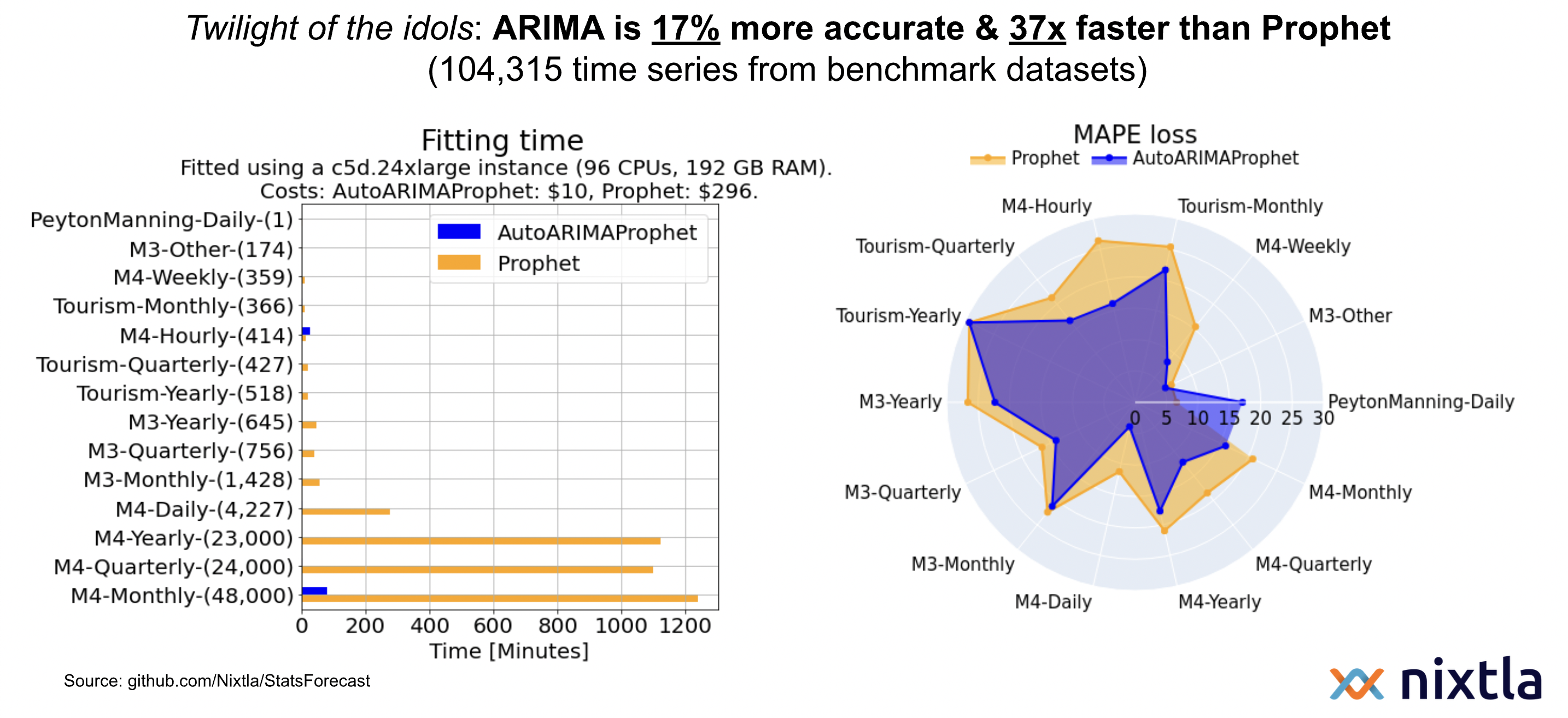 AutoArima is faster and more accurate than FB-Prophet in most cases. Replace it with two lines of code.We benchmarked on more than 100K series and show that you can improve MAPE and sMAPE forecast accuracy by 17% and 15% with 37x less computational time. Now you can replace Prophet with two lines of code and verify it for yourself.
