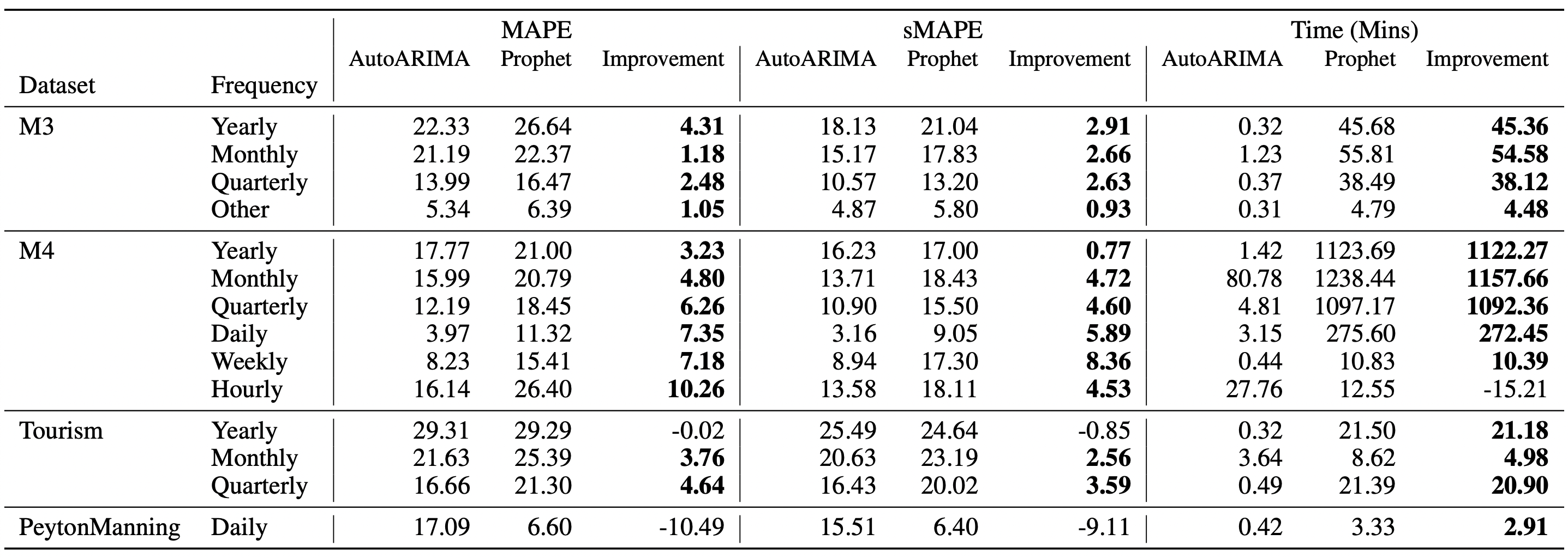The following table shows the MAPE, sMAPE and Time (in minutes) AutoARIMA improvements on Prophet for each dataset.