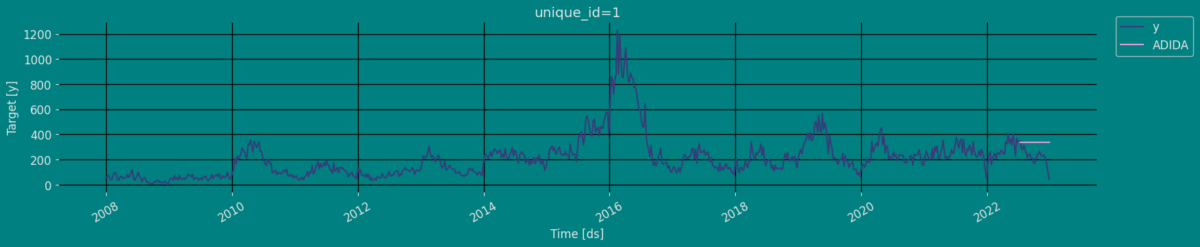 Now we are going to evaluate our model with the results of the predictions, we will use different types of metrics MAE, MAPE, MASE, RMSE, SMAPE to evaluate the accuracy.unique_id | metric | ADIDA | |