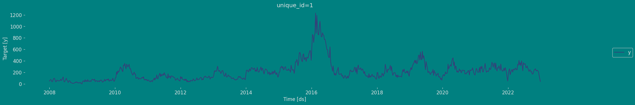 Plot a series using the plot method from the StatsForecast class. This method prints a random series from the dataset and is useful for basic EDA.