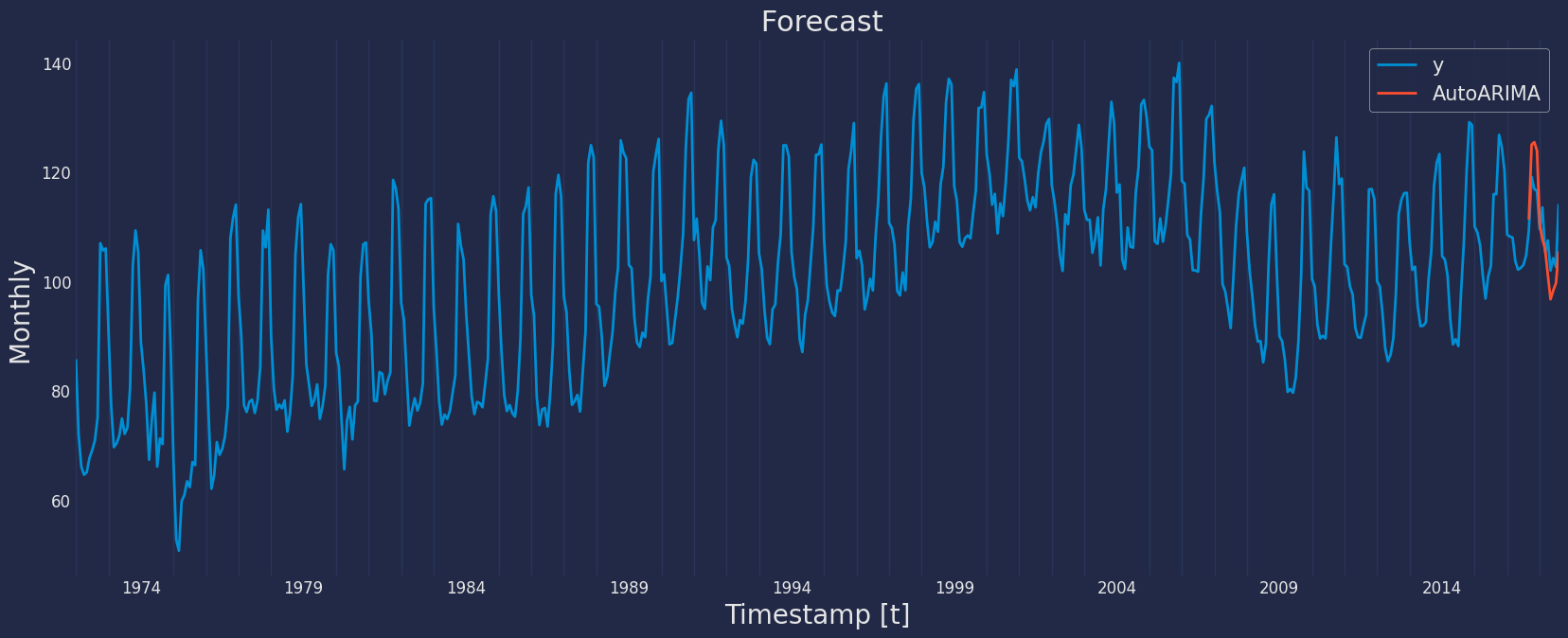 An autoARIMA is a time series model that uses an automatic process to select the optimal ARIMA (Autoregressive Integrated Moving Average) model parameters for a given time series. ARIMA is a widely used statistical model for modeling and predicting time series. The process of automatic parameter selection in an autoARIMA model is performed using statistical and optimization techniques, such as the Akaike Information Criterion (AIC) and cross-validation, to identify optimal values for autoregression, integration, and moving average parameters. of the ARIMA model. Automatic parameter selection is useful because it can be difficult to determine the optimal parameters of an ARIMA model for a given time series without a thorough understanding of the underlying stochastic process that generates the time series. The autoARIMA model automates the parameter selection process and can provide a fast and effective solution for time series modeling and forecasting. Thestatsforecast.models library brings the AutoARIMA function from