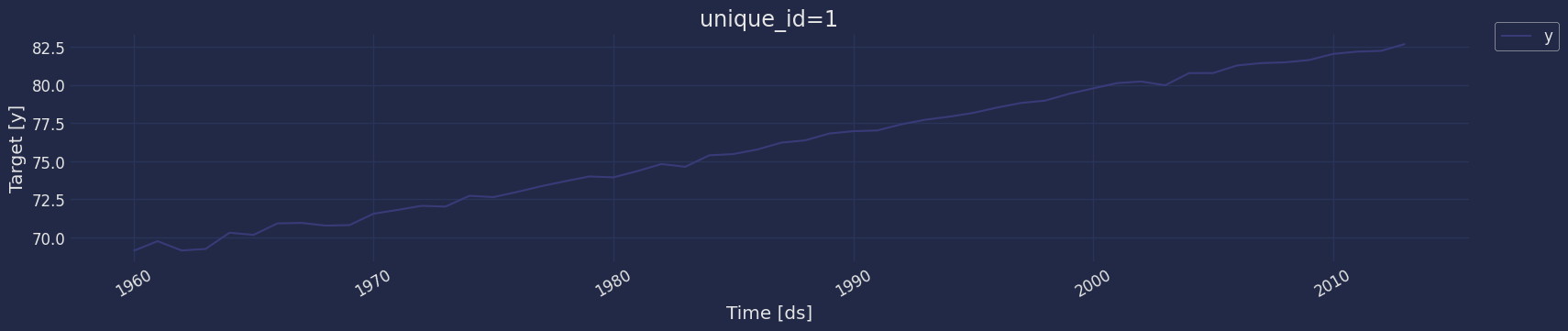 Plot some series using the plot method from the StatsForecast class. This method prints a random series from the dataset and is useful for basic EDA.