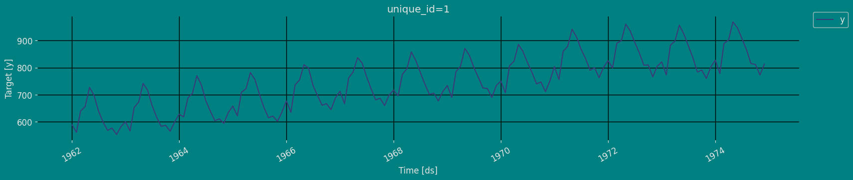 Plot some series using the plot method from the StatsForecast class. This method prints a random series from the dataset and is useful for basic EDA.