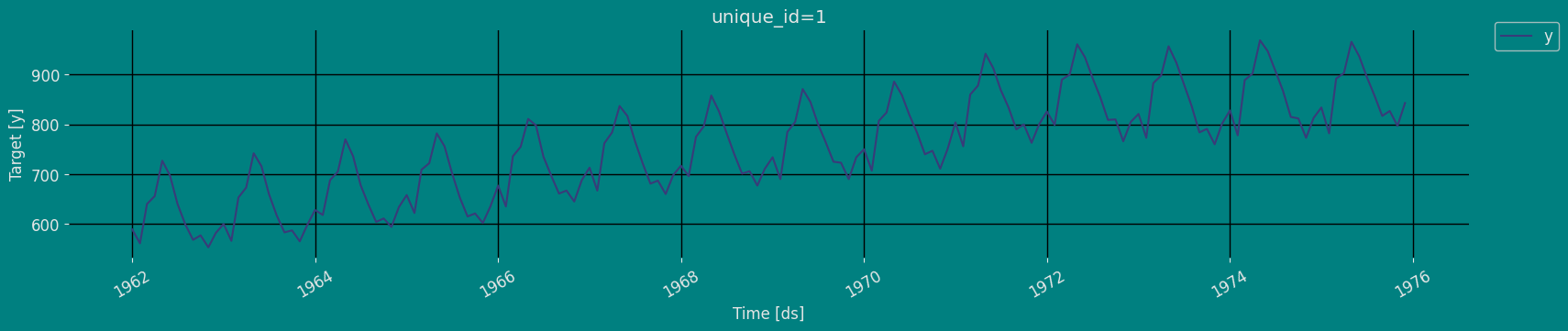 Plot some series using the plot method from the StatsForecast class. This method prints a random series from the dataset and is useful for basic EDA.