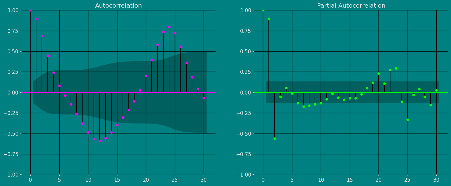 An Augmented Dickey-Fuller (ADF) test is a type of statistical test that determines whether a unit root is present in time series data. Unit roots can cause unpredictable results in time series analysis. A null hypothesis is formed in the unit root test to determine how strongly time series data is affected by a trend. By accepting the null hypothesis, we accept the evidence that the time series data is not stationary. By rejecting the null hypothesis or accepting the alternative hypothesis, we accept the evidence that the time series data is generated by a stationary process. This process is also known as stationary trend. The values of the ADF test statistic are negative. Lower ADF values indicate a stronger rejection of the null hypothesis. Augmented Dickey-Fuller Test is a common statistical test used to test whether a given time series is stationary or not. We can achieve this by defining the null and alternate hypothesis. Null Hypothesis: Time Series is non-stationary. It gives a time-dependent trend. Alternate Hypothesis: Time Series is stationary. In another term, the series doesn’t depend on time. ADF or t Statistic < critical values: Reject the null hypothesis, time series is stationary. ADF or t Statistic > critical values: Failed to reject the null hypothesis, time series is non-stationary.Autocorrelation plots