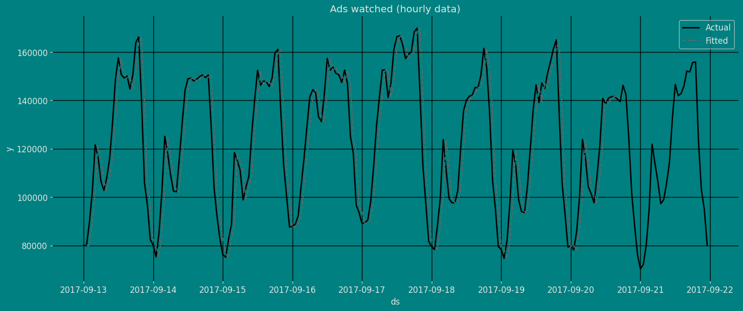 Plot some series using the plot method from the StatsForecast class. This method prints a random series from the dataset and is useful for basic EDA.