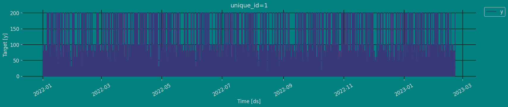Plot some series using the plot method from the StatsForecast class. This method prints a random series from the dataset and is useful for basic EDA.