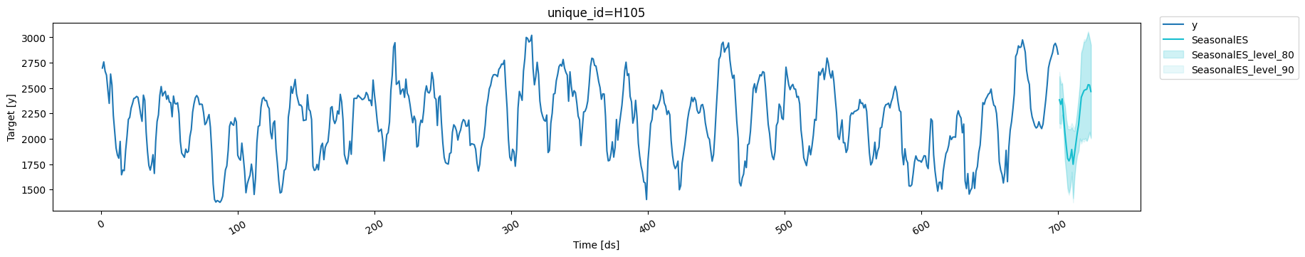 StatsForecast makes it simple to add conformal prediction to any forecasting model. We’ll demonstrate with models that don’t natively provide prediction intervals:- SeasonalExponentialSmoothing: A simple smoothing model
