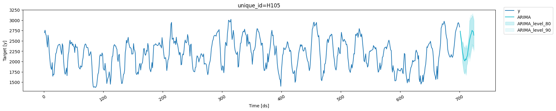 h: Forecast horizon (number of steps ahead)level: List of confidence levels (e.g.,[80, 90]for 80% and 90% intervals)