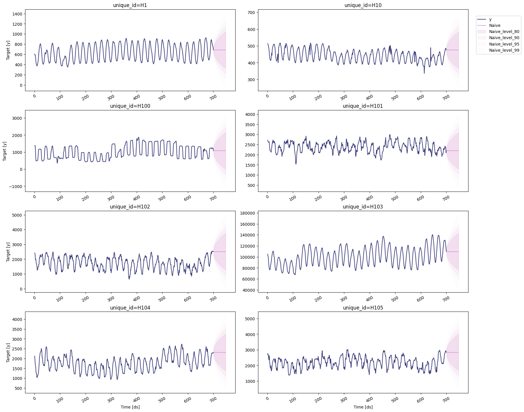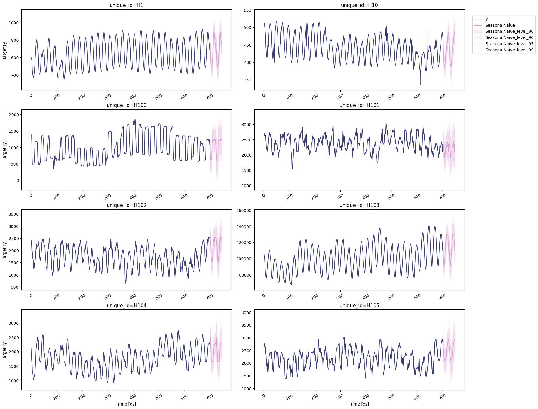 h: An integer that represent the forecasting horizon. In this case, we’ll forecast the next 48 hours.level: A list of floats with the confidence levels of the prediction intervals. For example,level=[95]means that the range of values should include the actual future value with probability 95%.