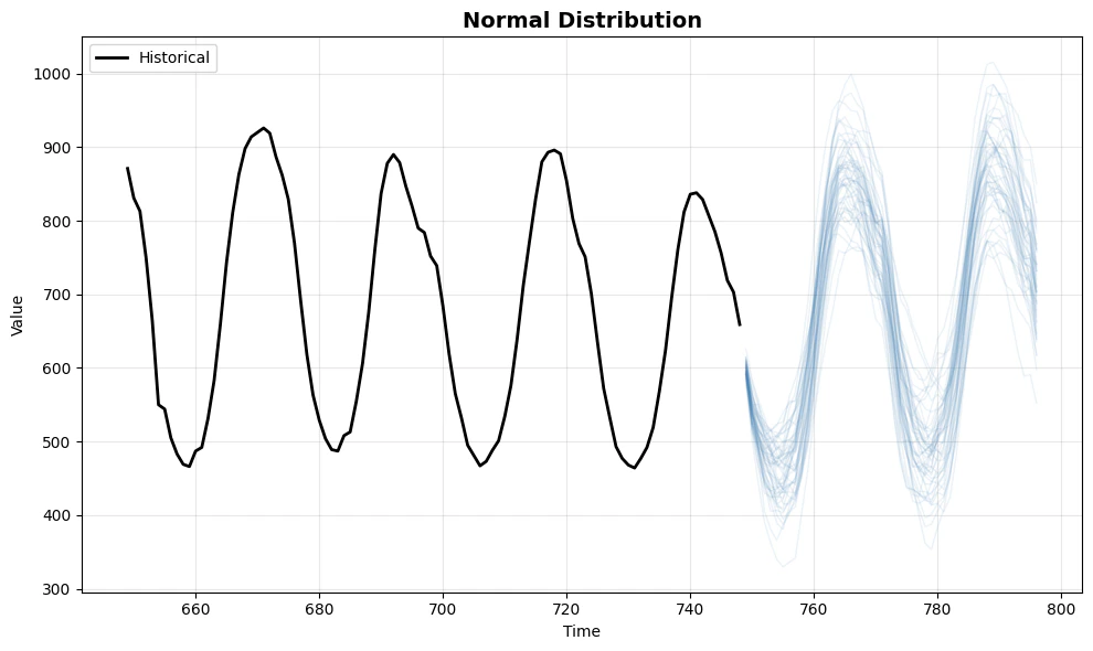 - Normal distribution provides symmetric paths around the mean - suitable when errors are well-behaved