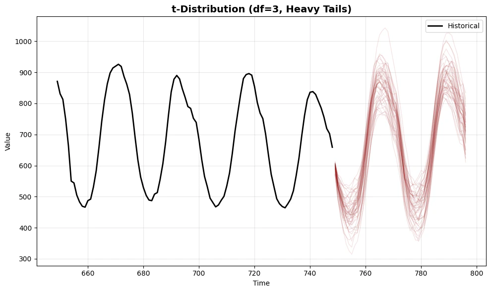 - t-distribution (df=3) - User-specified heavy tails for stress testing