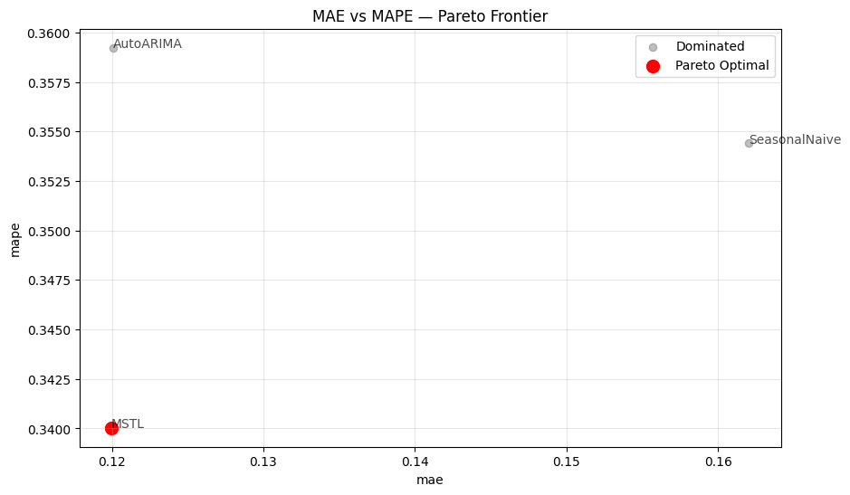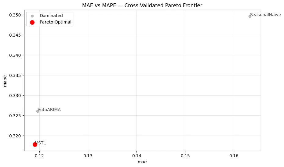 After training several forecasting models, a common question is: which one should I deploy? If you optimize for a single metric — say MAE — the answer is straightforward: pick the lowest MAE. But real-world requirements rarely reduce to a single number. You might care about:- Accuracy (MAE, RMSE): how close are point forecasts to actuals?